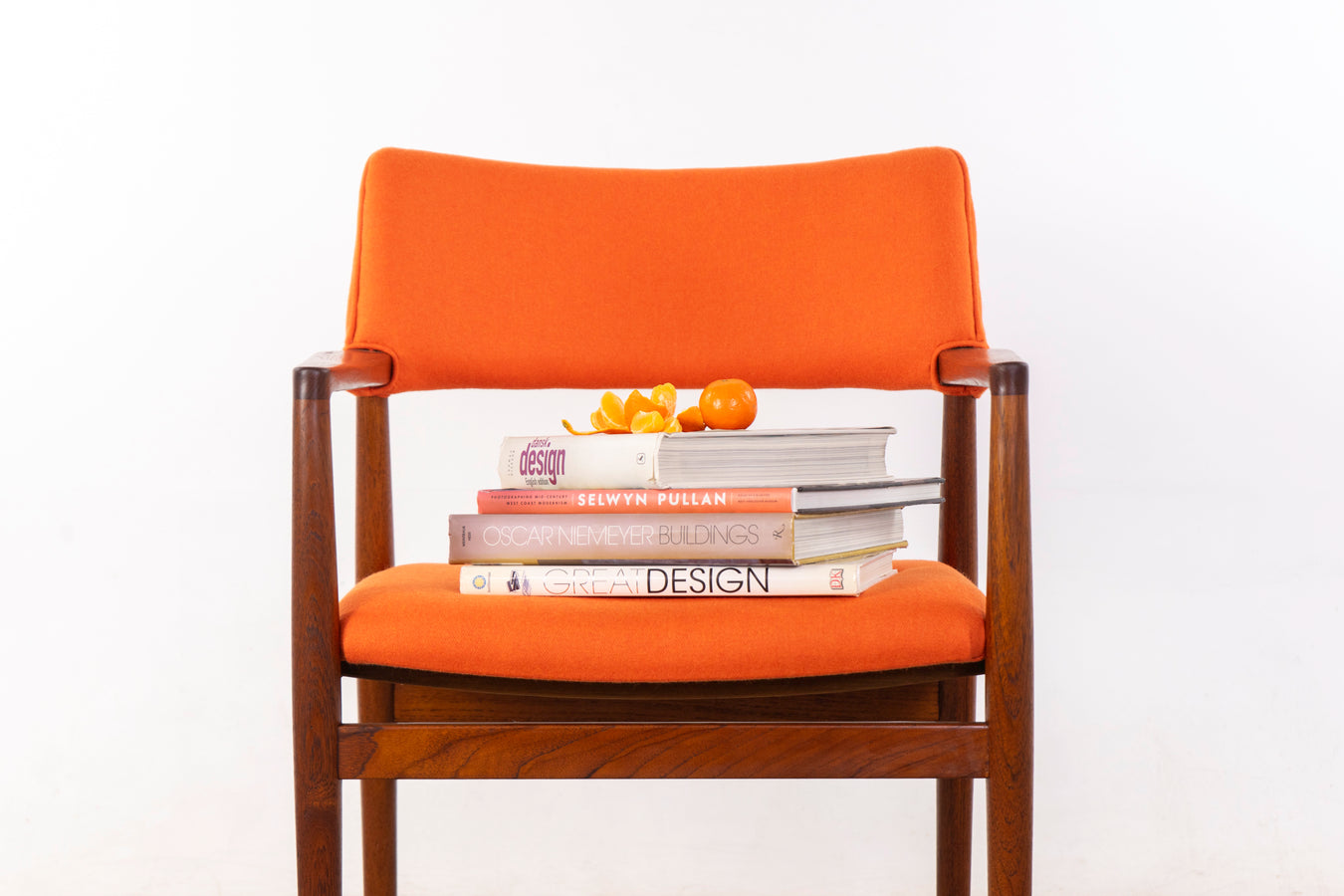 Danish Modern teak & oak dining chair, circa 1960's. Chair features a sculpted teak ply back and a solid oak frame. The newly upholstered wool ...