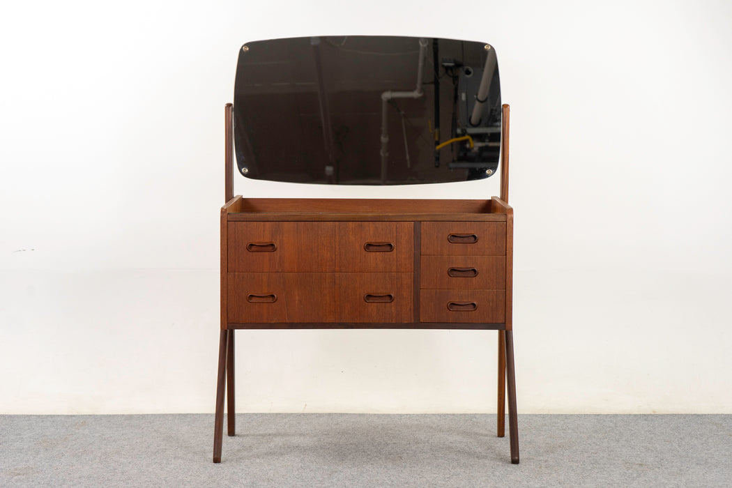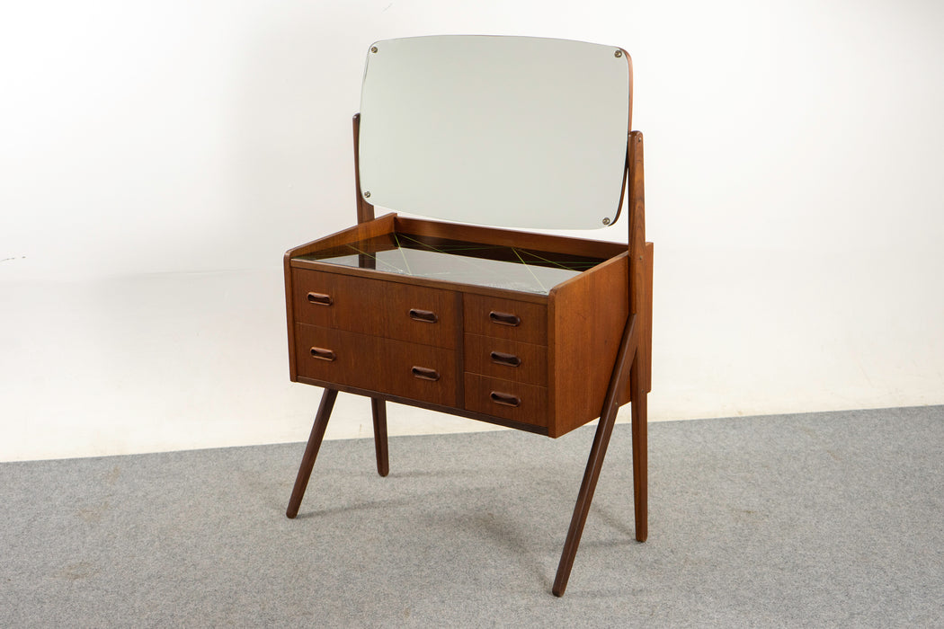 Teak Danish vanity, circa 1960s. Solid wood trim and stunning bookmatched veneer. Dramatic scissor legs and original swivel mirror. Atomic patterned glass top with some minor wear and tear. Stunning silhouette!